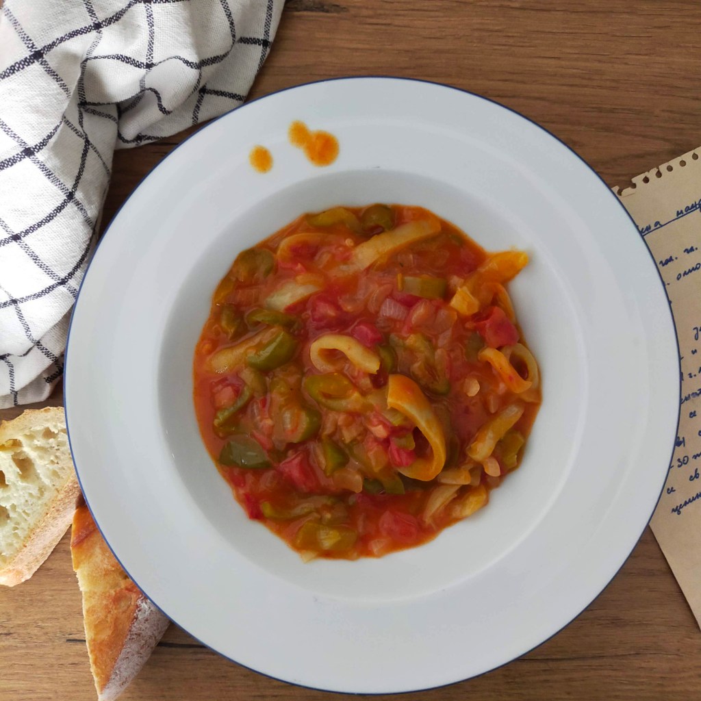 Pour un plat vraiment complet, on peut ajouter vers la fin de la cuisson une boîte de haricots blancs ou de pois chiches mais traditionnellement c’est un mijoté de légumes léger pour l’été, à servir avec du pain. Mais mes filles l’ont mangé avec des pâtes, c’est bon aussi 😉