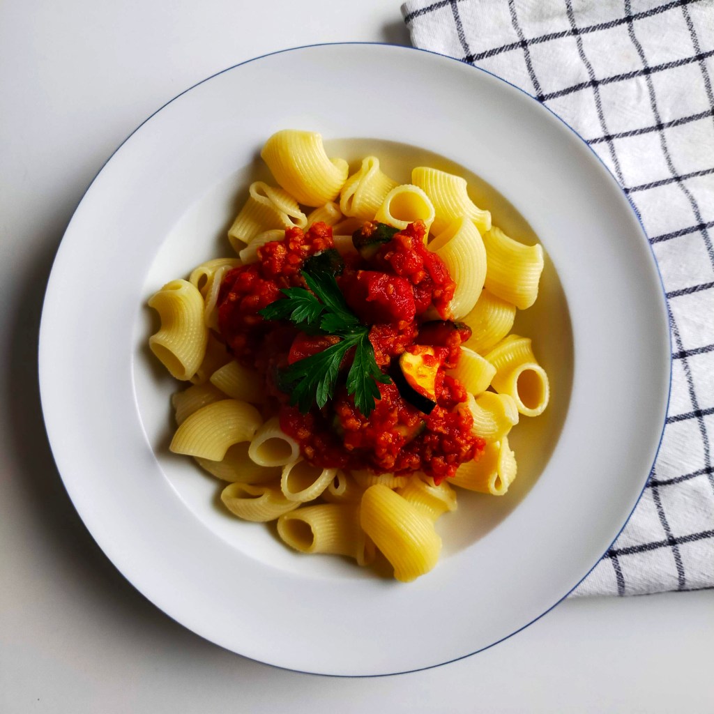 Je vous propose aujourd’hui une nouvelle idée de recette simple et rapide avec des PST – ou protéines de soja texturées. Pour l’été, je vous avais partagé une recette à base de tomates fraîches (ici) – alors que la proposition d’aujourd’hui est adaptable à la saison car on utilise des tomates en conserve et un légume de saison au choix (ou on simplifie encore en omettant le légume;)
