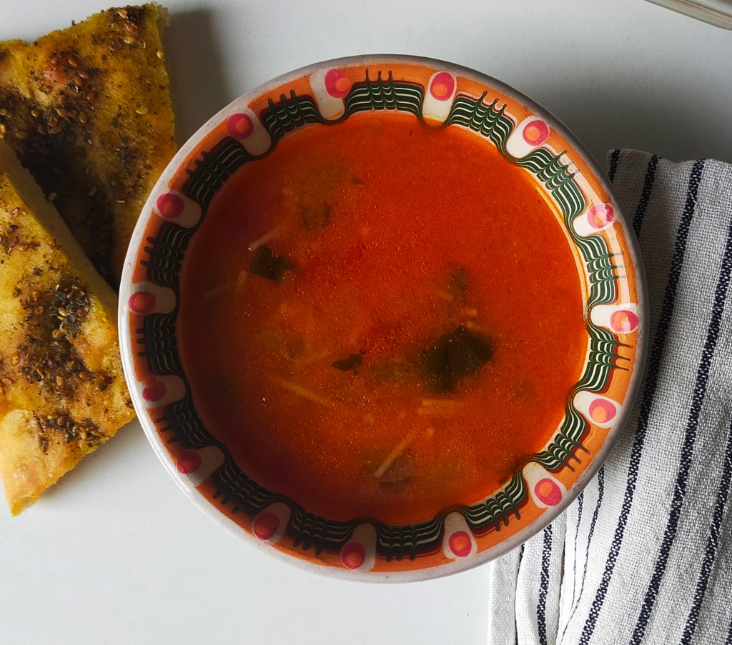 Voici une recette de soupe extrêmement facile et économique mais très satisfaisante, inspirée de la soupe tomates – vermicelles de la mamie de mon (futur;) mari – que j’ai « reconstituée » d’après ses souvenirs et il en a validé le goût !