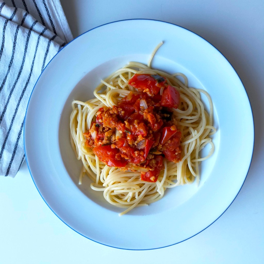 Je vous propose aujourd’hui une nouvelle idée de recette simple et rapide avec des tomates fraîches et des PST – ou protéines de soja texturées. On les trouve facilement en magasin bio en vrac ou en sachet; je n’aime (pour le moment) que les petites PST (ou PST « émincées ») qui se cuisinent très simplement et dont la texture est agréable (j’ai du mal avec la texture spongieuse des plus gros formats de PST…).