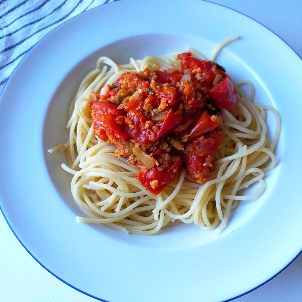 Equilibrée tout en étant facile à faire, on a beaucoup aimé cette « sauce » avec des spaghetti pour le dîner 😉